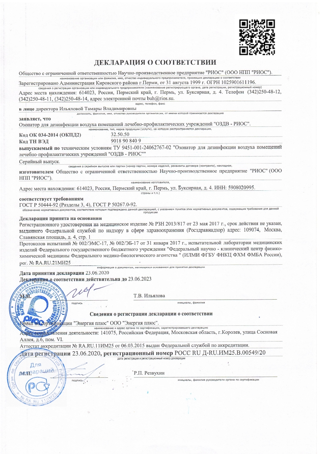 При применении озонатора «ОЗДВ-РИОС» концентрация озона в воздухе помещения достигает 6±0.5 мг/м3 .